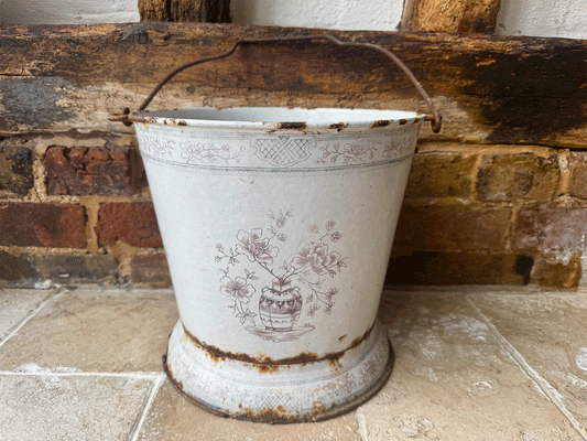 Rare Large Antique French Decorative Pink and White Enamel Bucket
