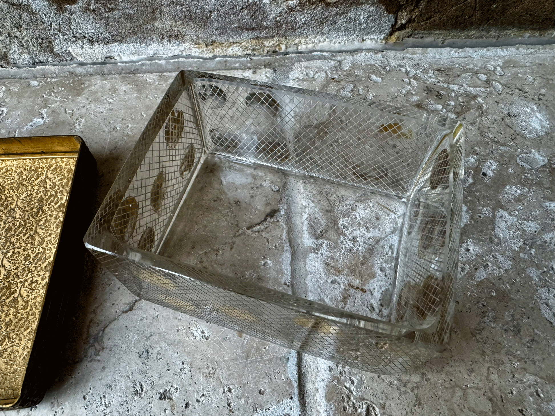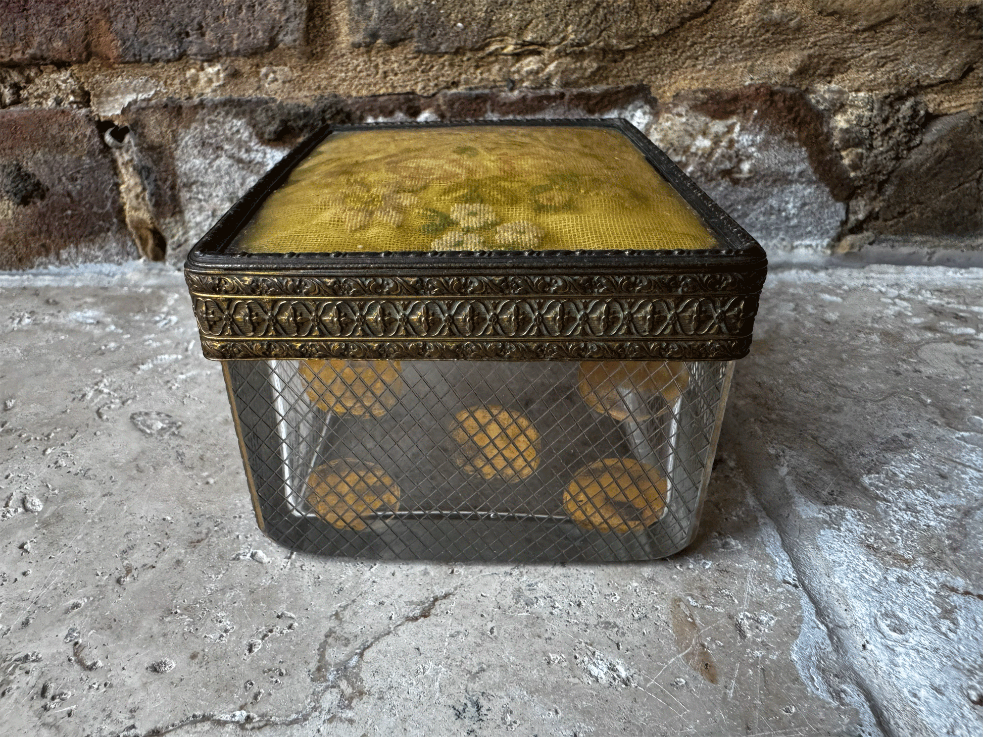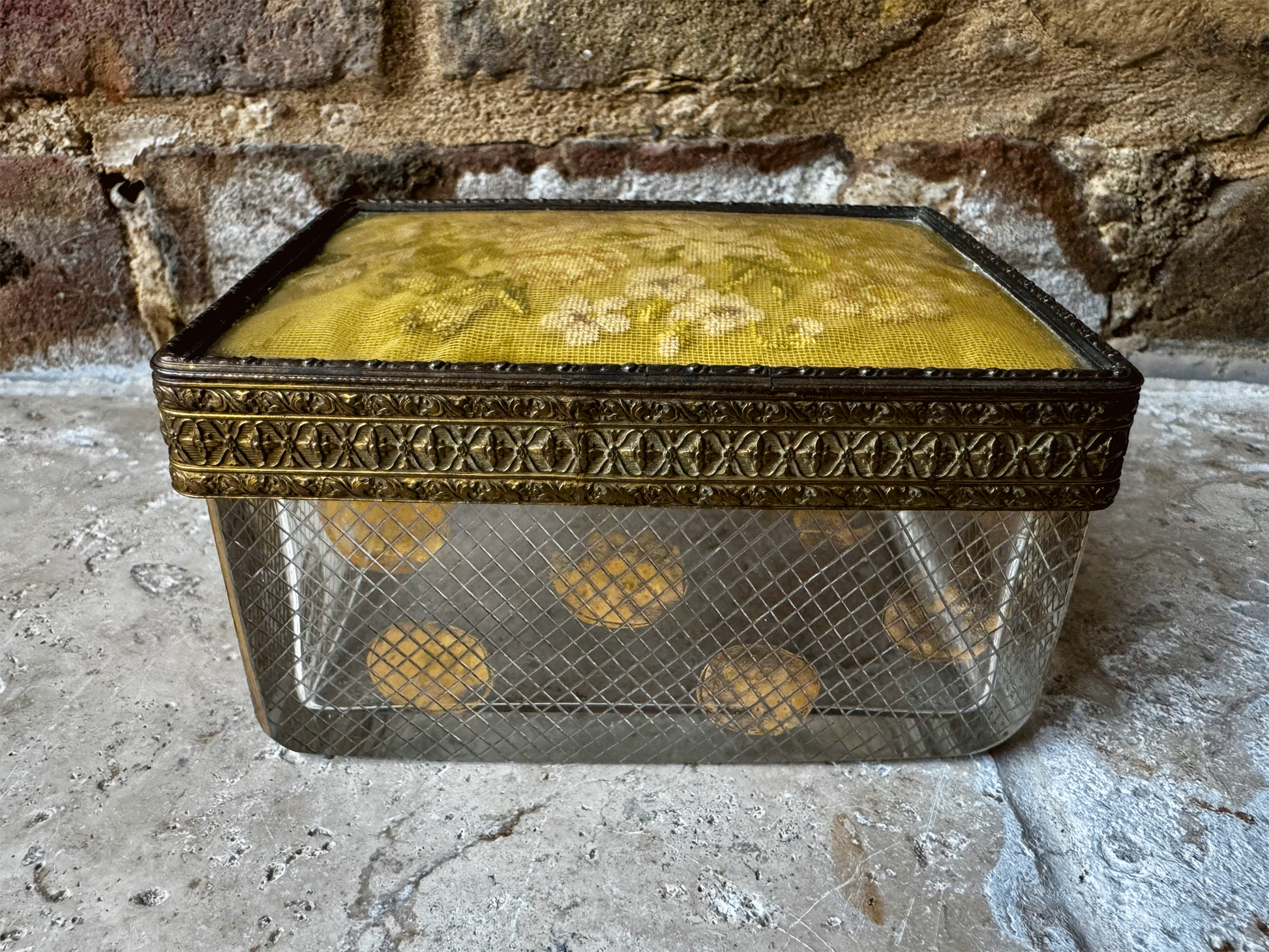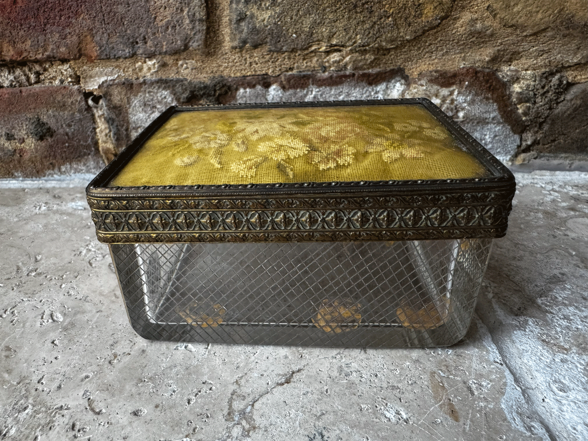The heavyweight glass base features acid etched lattice work and faded gold polka dots. The detail continues through to the lid which has a stunning inlaid pattern to the ormolu metalwork on both the border and underside, and a very pretty embroidered top, which is protected under a plastic coating.