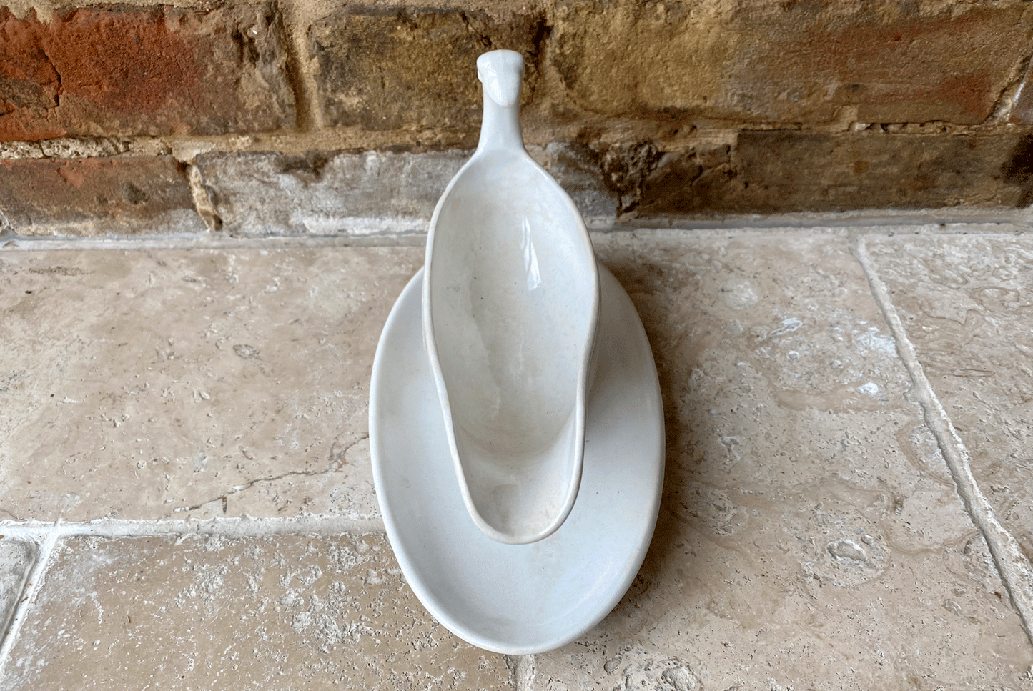 Dating from the early 1900s, this French white ironstone gravy boat features a lovely scuplted handle featuring a scuplted head. With an integral base plate, this allows drips of sauce of gravy to be captured here rather than dripping down onto the table.
