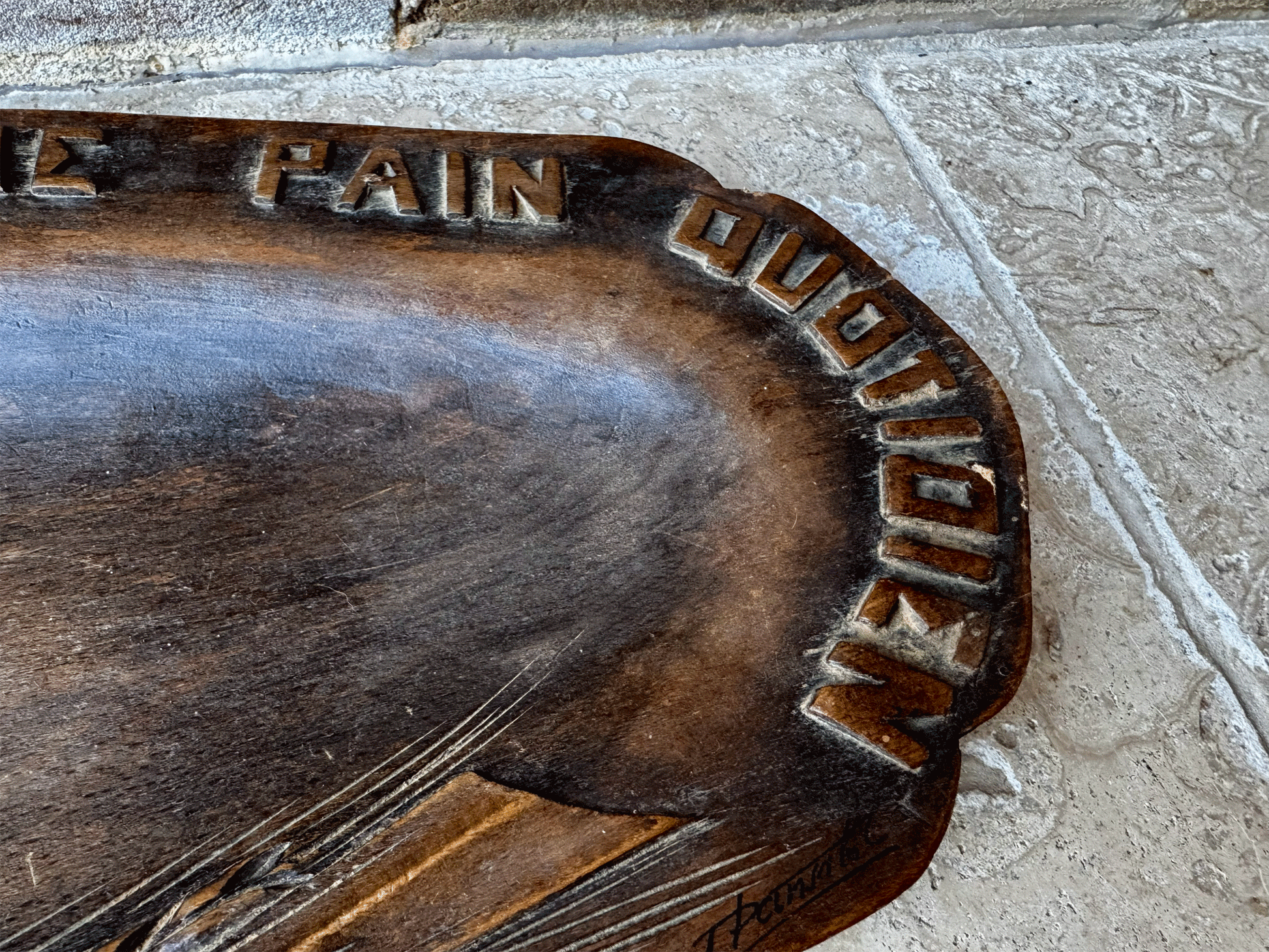 A nice example of a vintage oval shaped antique French bread platter with a deeply carved motto, dating from the mid 20th Century, with a "Donnez Nous Notre Pain Quotiden" motto in French.